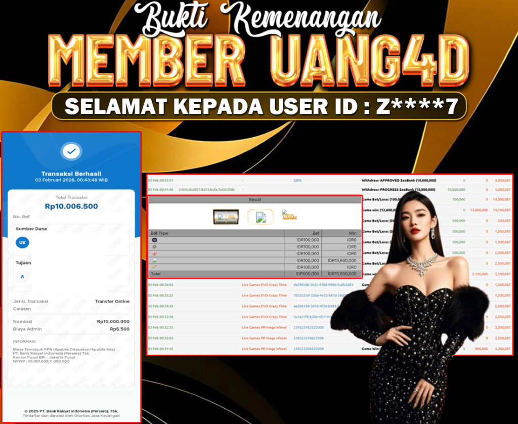 Setiap hari, member UANG4D berhasil meraih jackpot besar dari berbagai macam permainan livecasino ternama yang kami sediakan, seperti Roullete, Dragon & Tiger, Qiu Qiu dan masih banyak lagi. Kami secara rutin menampilkan bukti screenshot atau rekapan kemenangan yang berhasil diraih, mulai dari kemenangan ratusan ribu hingga puluhan juta rupiah. Semua slip kemenangan ini kami hadirkan untuk membuktikan bahwa di UANG4D, peluang menang itu nyata.