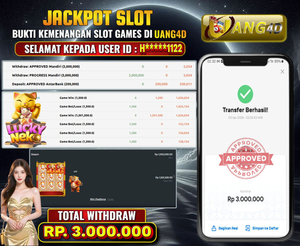 UANG4DJACKPOT SLOT GACOR LUCKY NEKO 03 APRIL 2025, Jackpot Slot, Kemenangan Slot, Bukti Kemenangan Slot, Kemenangan Slot Pragmatic Play, Menang Slot online, Slot Gacor, Situs Aman Terpercaya, WD Berapapun Pasti DI Bayar Tuntas, Maxwin Slot Online.