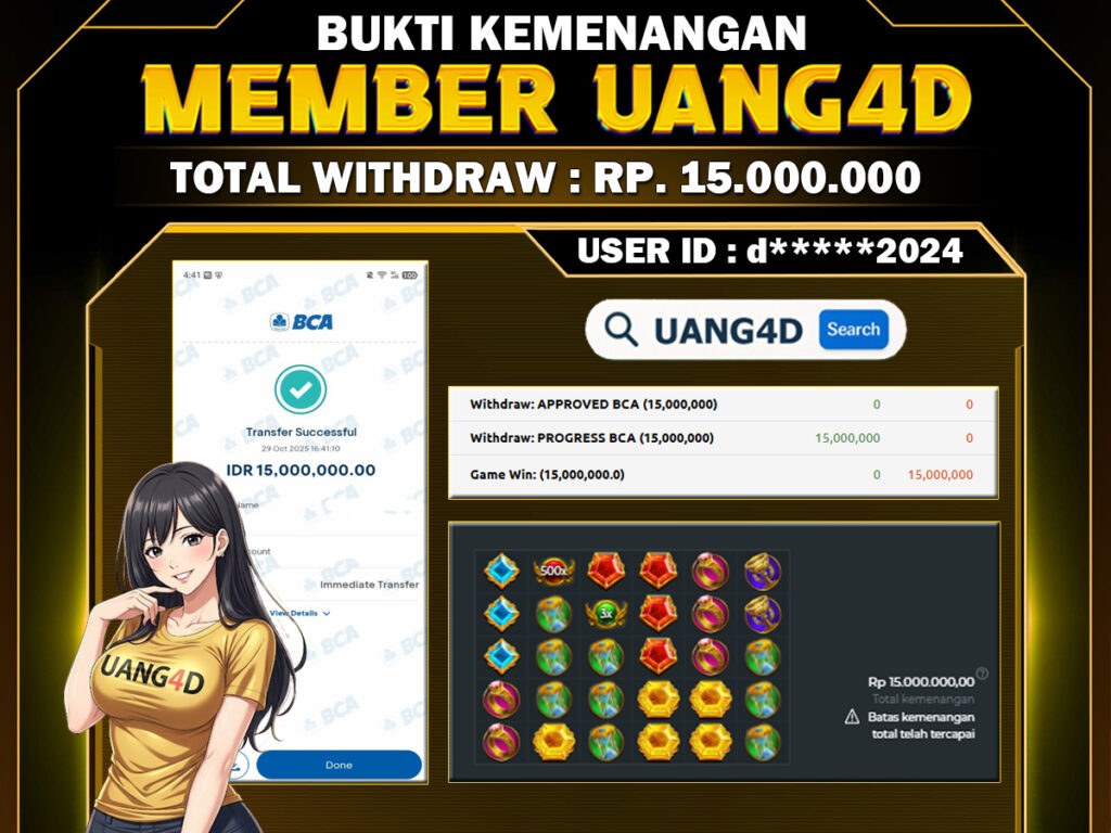 Jangan lewatkan kesempatan untuk meraih kemenangan besar. Daftar sekarang di UANG4D dan rasakan pengalaman bermain slot terbaik yang pernah ada! Putar gulungan, menangkan jackpot, dan jadilah bagian dari komunitas pemain sukses kami!