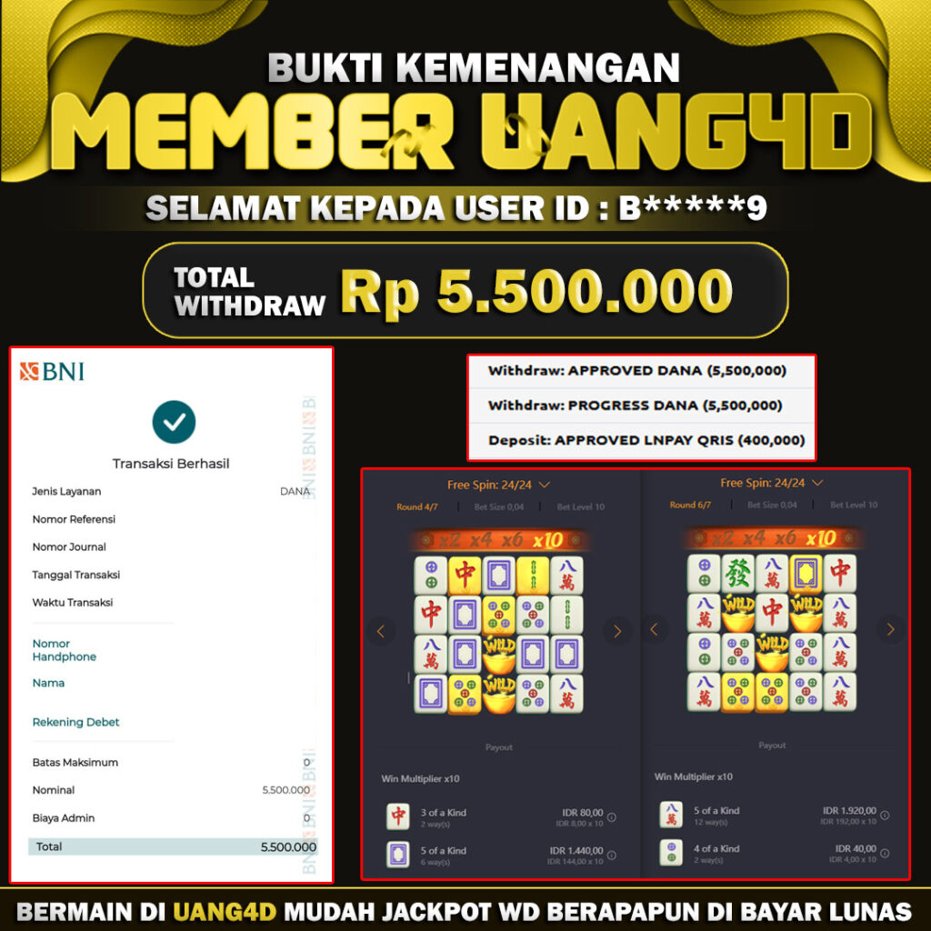 Jangan lewatkan kesempatan untuk meraih kemenangan besar. Daftar sekarang di UANG4D dan rasakan pengalaman bermain slot terbaik yang pernah ada! Putar gulungan, menangkan jackpot, dan jadilah bagian dari komunitas pemain sukses kami!