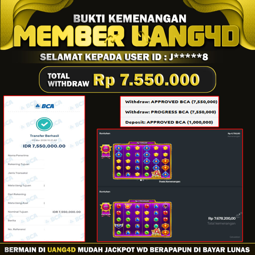 Jangan lewatkan kesempatan untuk meraih kemenangan besar. Daftar sekarang di UANG4D dan rasakan pengalaman bermain slot terbaik yang pernah ada! Putar gulungan, menangkan jackpot, dan jadilah bagian dari komunitas pemain sukses kami!