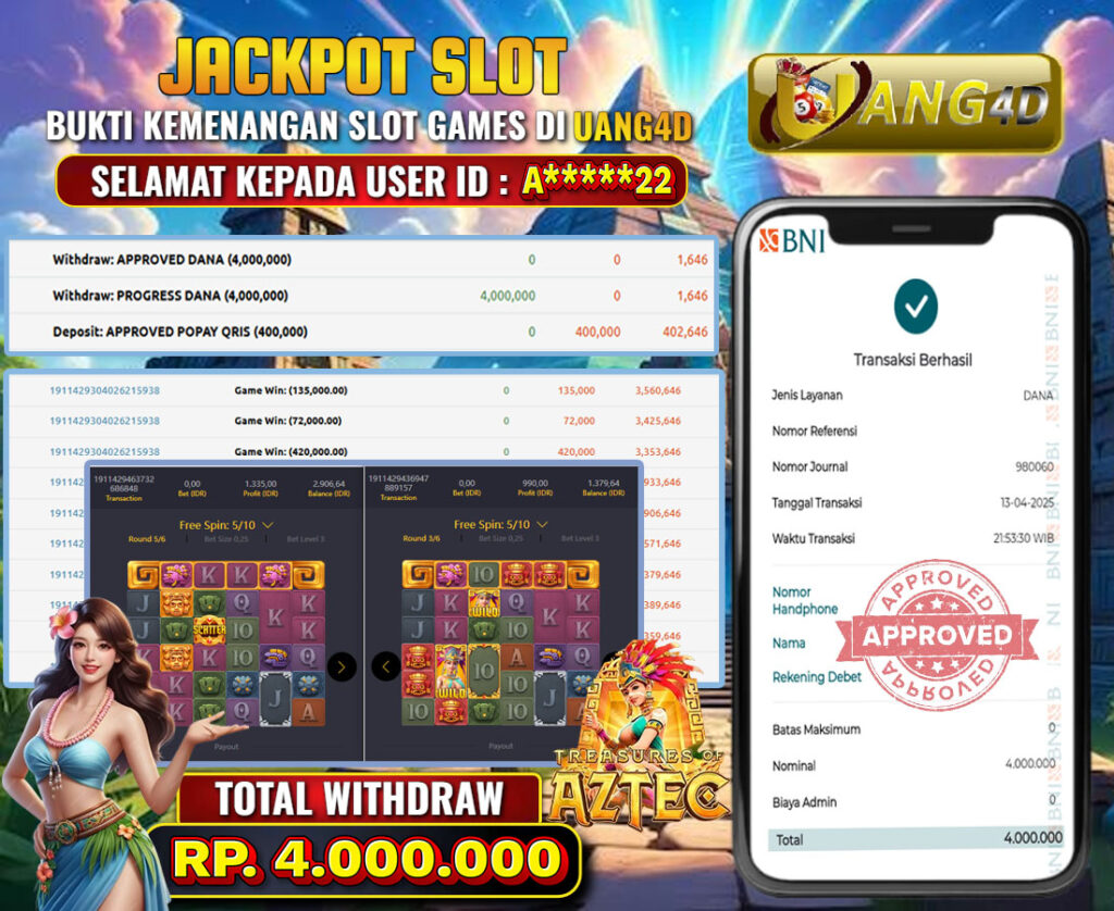 UANG4D –JACKPOT SLOT TREASURES OF AZTEC 14 APRIL 2025, Kemenangan Slot, Bukti Kemenangan Slot, Kemenangan Slot Pragmatic Play, Menang Slot online, Slot Gacor, Situs Aman Terpercaya, Withdraw Berapapun Pasti DI Bayar Tuntas, Maxwin Slot Online.