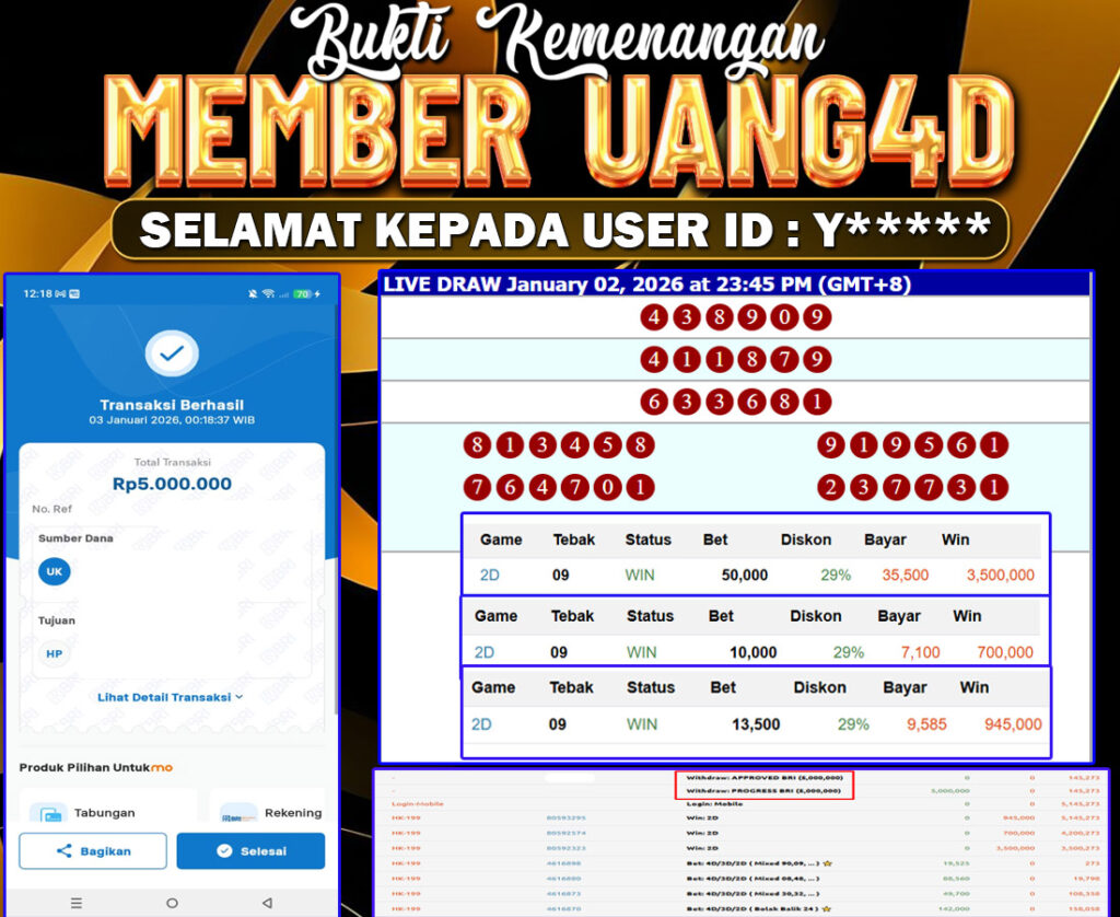 Setiap hari, member UANG4D berhasil meraih jackpot besar dari berbagai provider togel ternama yang kami sediakan, seperti Sydney, Singapore, Hongkong dan masih banyak lagi. Kami secara rutin menampilkan bukti screenshot atau rekapan kemenangan yang berhasil diraih, mulai dari kemenangan ratusan ribu hingga puluhan juta rupiah. Semua slip kemenangan ini kami hadirkan untuk membuktikan bahwa di UANG4D, peluang menang itu nyata.
