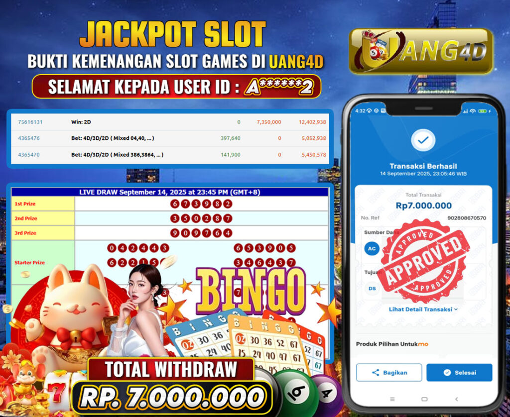 UANG4D dikenal sebagai situs terpercaya yang selalu menghadirkan pengalaman bermain slot online yang aman, fair, dan berlisensi resmi. Di sini, kami tidak hanya sekadar memberikan janji, tapi bukti nyata berupa slip kemenangan yang dapat Anda lihat secara langsung.