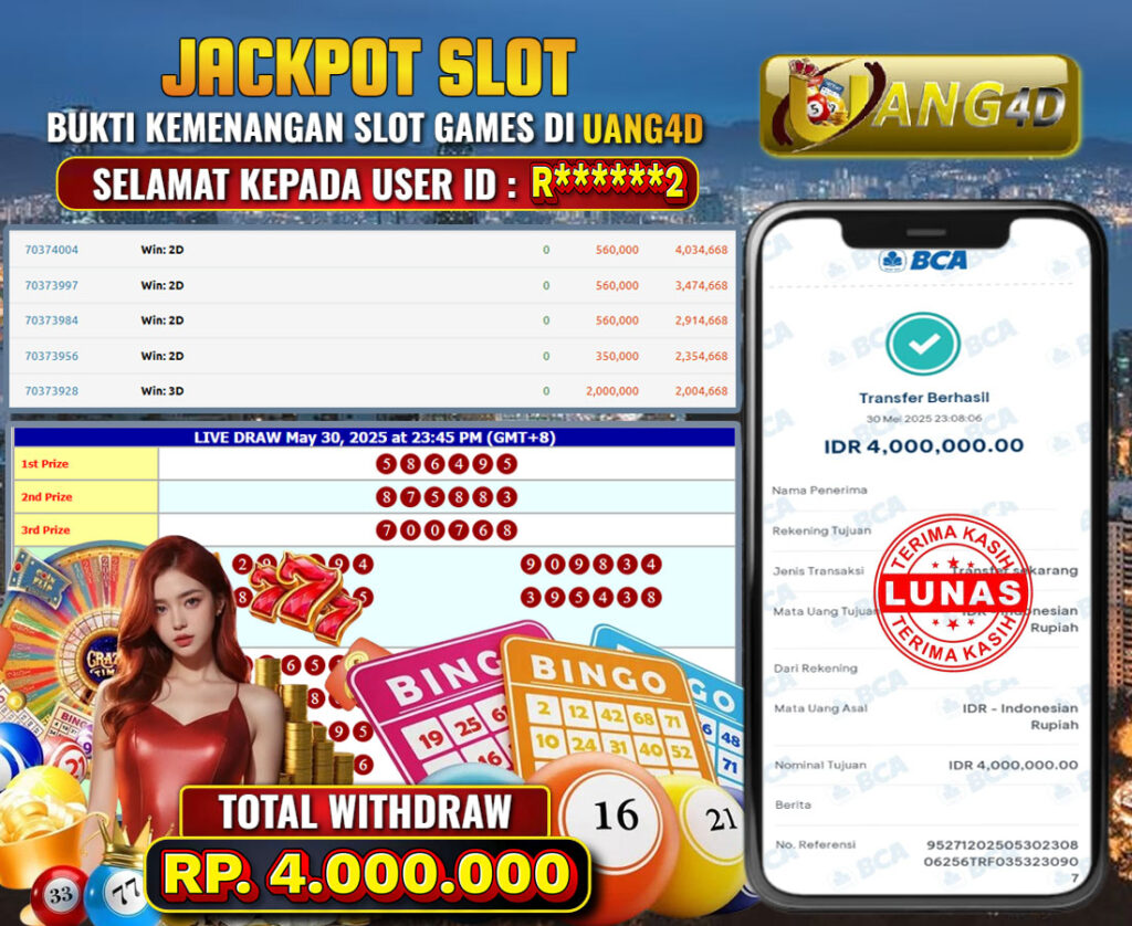 UANG4D dikenal sebagai situs terpercaya yang selalu menghadirkan pengalaman bermain slot online yang aman, fair, dan berlisensi resmi. Di sini, kami tidak hanya sekadar memberikan janji, tapi bukti nyata berupa slip kemenangan yang dapat Anda lihat secara langsung.