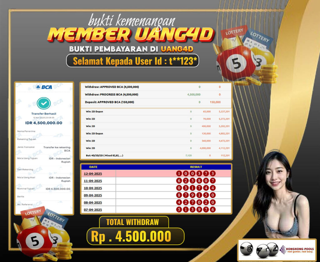 Setiap hari, member UANG4D berhasil meraih jackpot besar dari berbagai provider togel ternama yang kami sediakan, seperti Sydney, Singapore, Hongkong dan masih banyak lagi. Kami secara rutin menampilkan bukti screenshot atau rekapan kemenangan yang berhasil diraih, mulai dari kemenangan ratusan ribu hingga puluhan juta rupiah. Semua slip kemenangan ini kami hadirkan untuk membuktikan bahwa di UANG4D, peluang menang itu nyata.