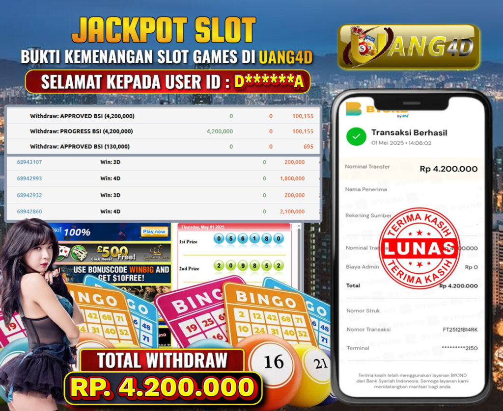 UANG4D dikenal sebagai situs terpercaya yang selalu menghadirkan pengalaman bermain slot online yang aman, fair, dan berlisensi resmi. Di sini, kami tidak hanya sekadar memberikan janji, tapi bukti nyata berupa slip kemenangan yang dapat Anda lihat secara langsung.